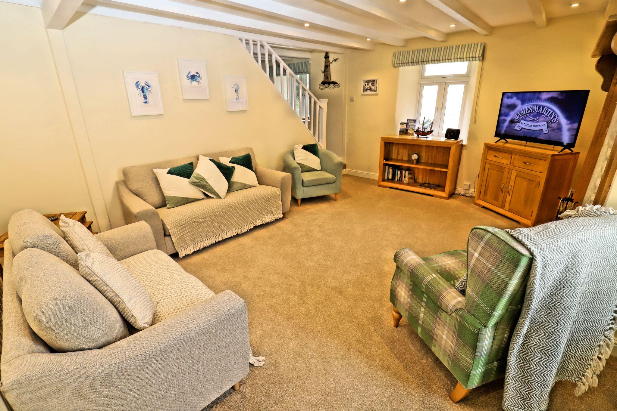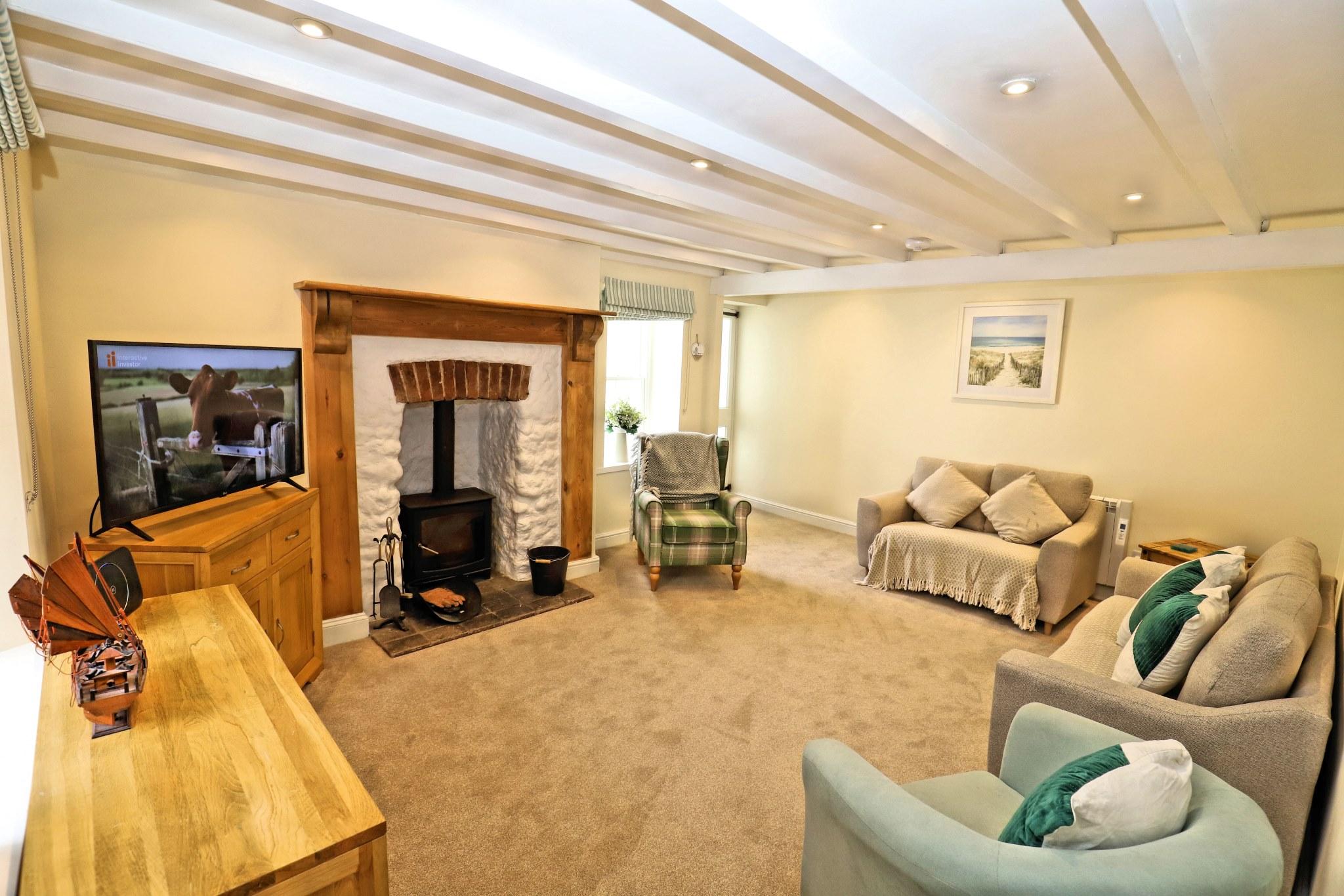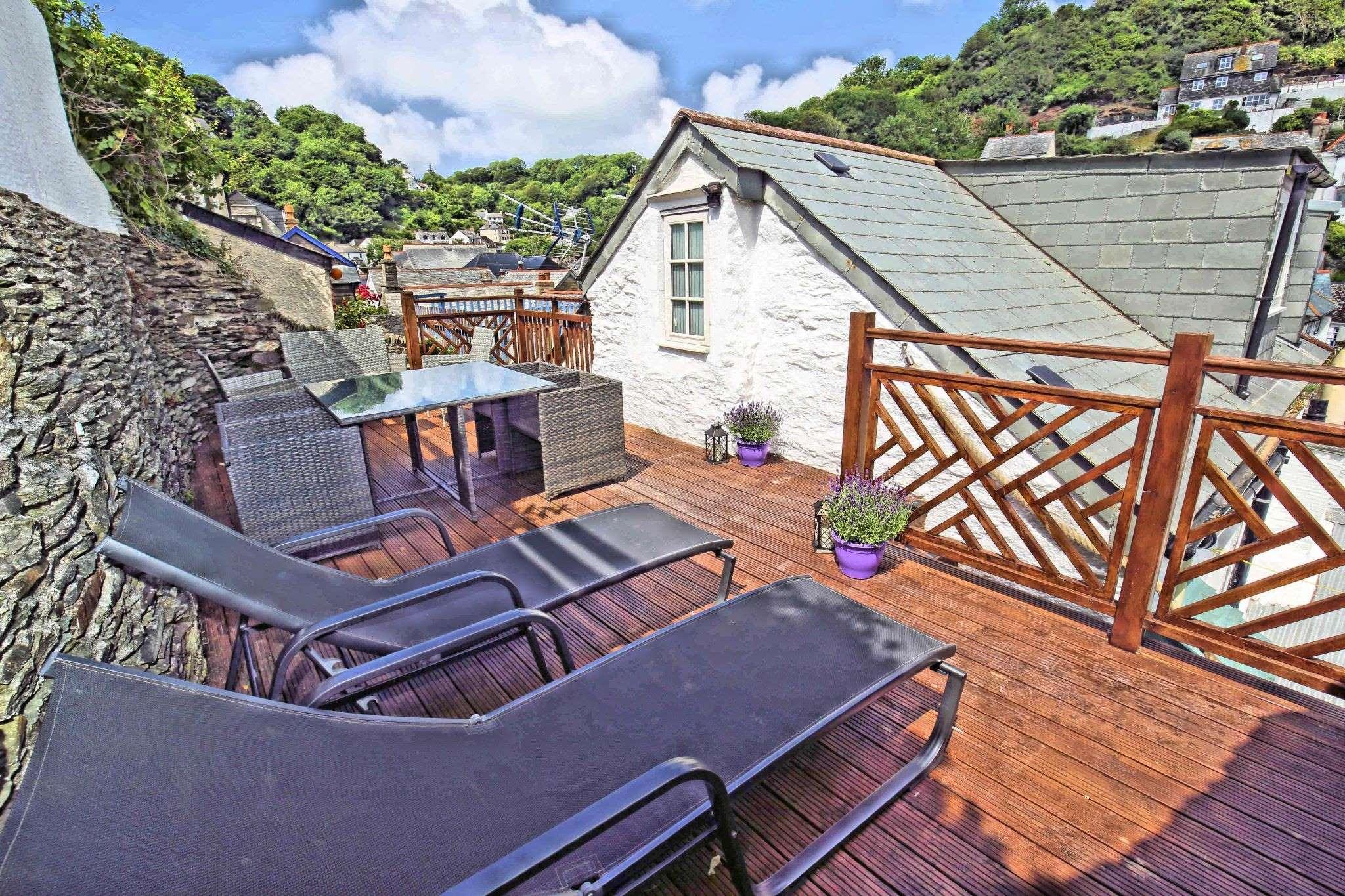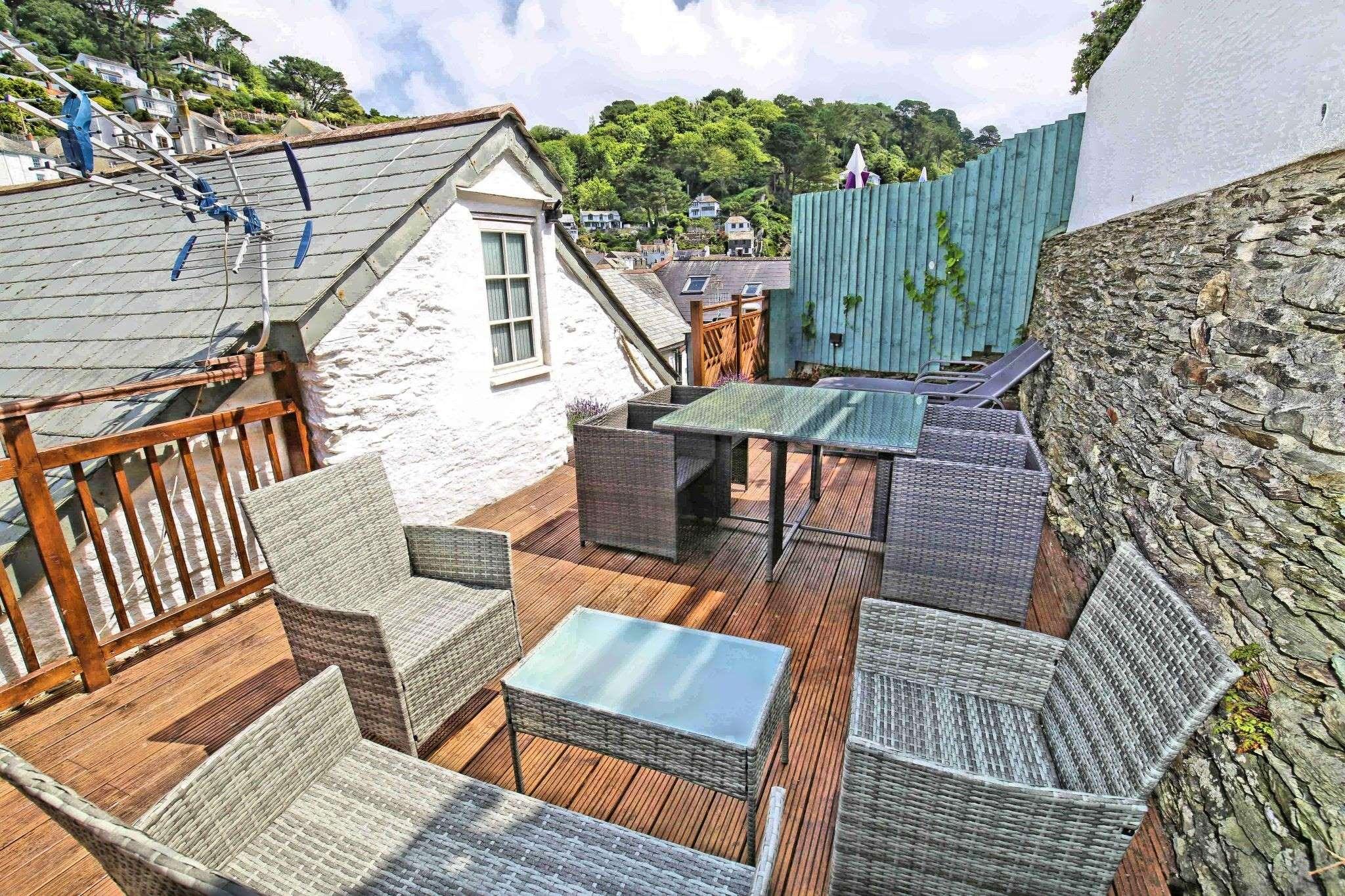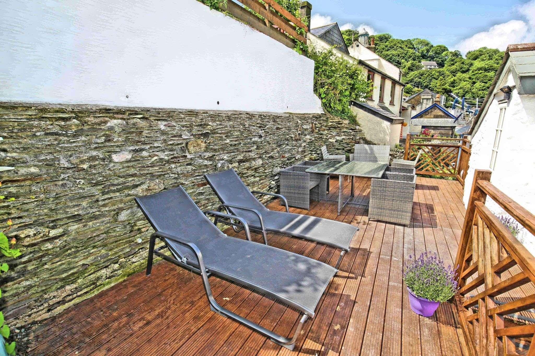 Barfleur House is a completely refurbished 3 bedroom property located very close to Polperro harbour. The house is set over 3 floors has 2 bath/shower rooms and also has an attractive outside seating area to take in the full atmosphere of this picturesque working fishing harbour. 13 steps take you to the front door (note: door width is 20 inches, a standard door is 30 inches), entry is via a porch into a very comfortable lounge with log burner and feature wooden mantlepiece. A further door to a large kitchen/diner, the kitchen is well equipped for self catering and includes an electric oven and hob, microwave, dishwasher, a 60/40 fridge/freezer and a washing machine. There is seating for 6 guests in the dining area. A rear door off the kitchen leads out to steps up (18 steps with a minimum width of 19 inches) to the outside seating area which features table and chairs and two sun loungers. The first floor has two double bedrooms and a twin bedroom, there is also a shower room with toilet on the first floor. The second floor is a second lounge with feature beamed vaulted ceiling, please note there are varying head heights due to the sloping ceiling but the main space is suitable for all. There is also a bathroom with corner bath and toilet on the second floor. Parking for one car is included (a permit for the main Polperro Car Park), the house also offers wi-fi and is pet friendly and up to 2 dogs can stay free of charge. Heating throughout is via electric panel heaters (heated towel rails in the bathrooms). Logs for the log burner are not supplied but can be purchased locally