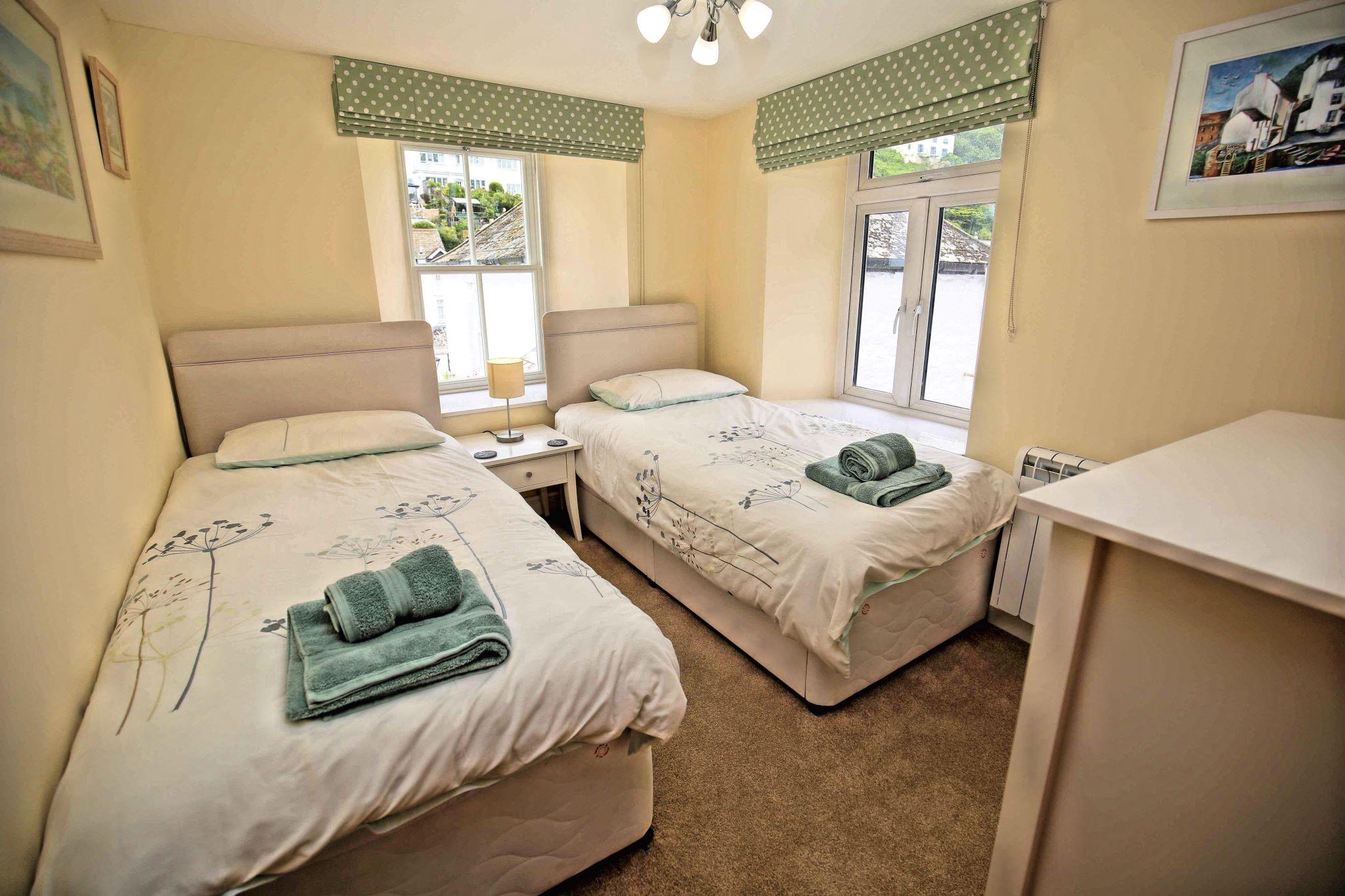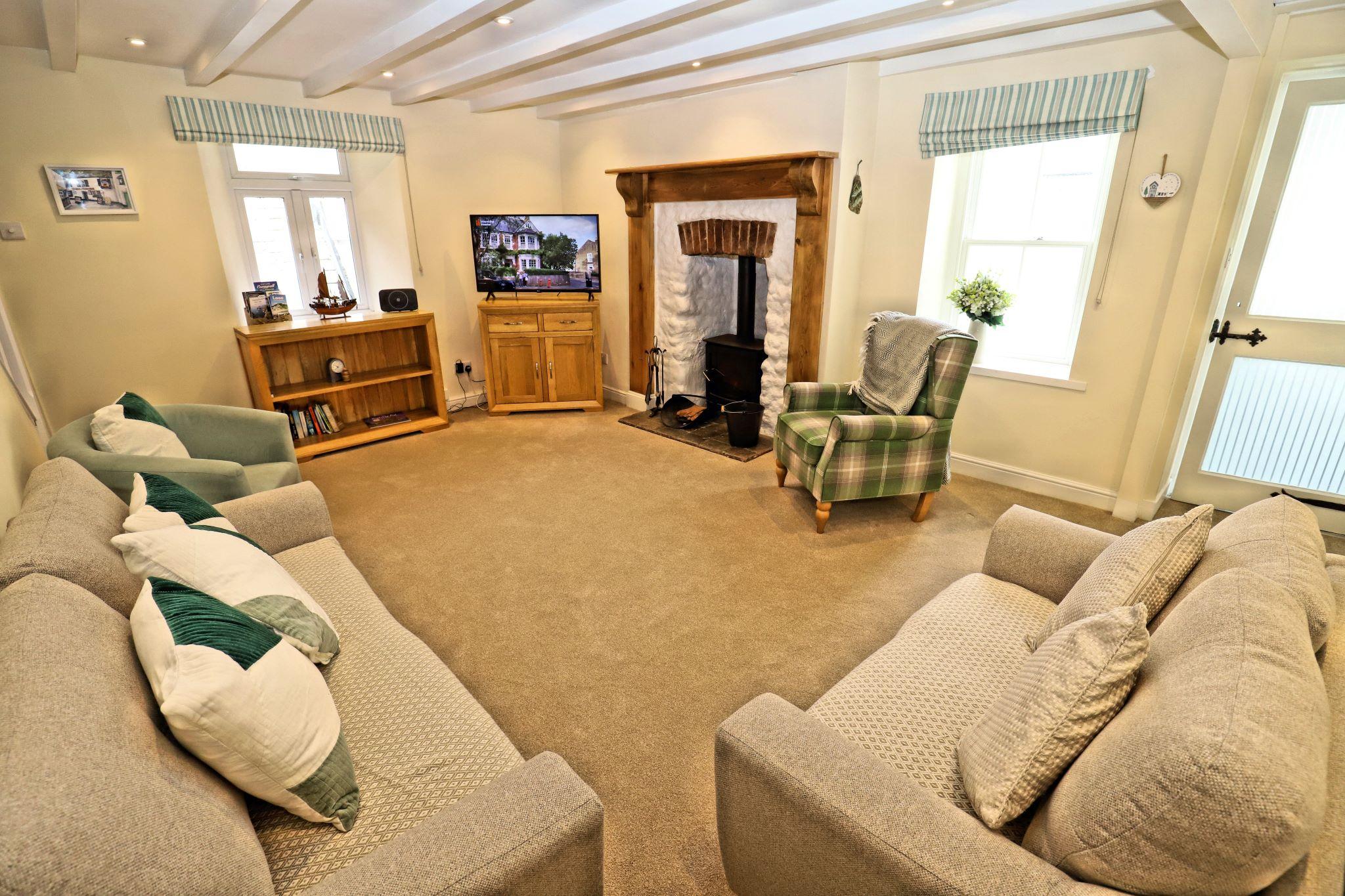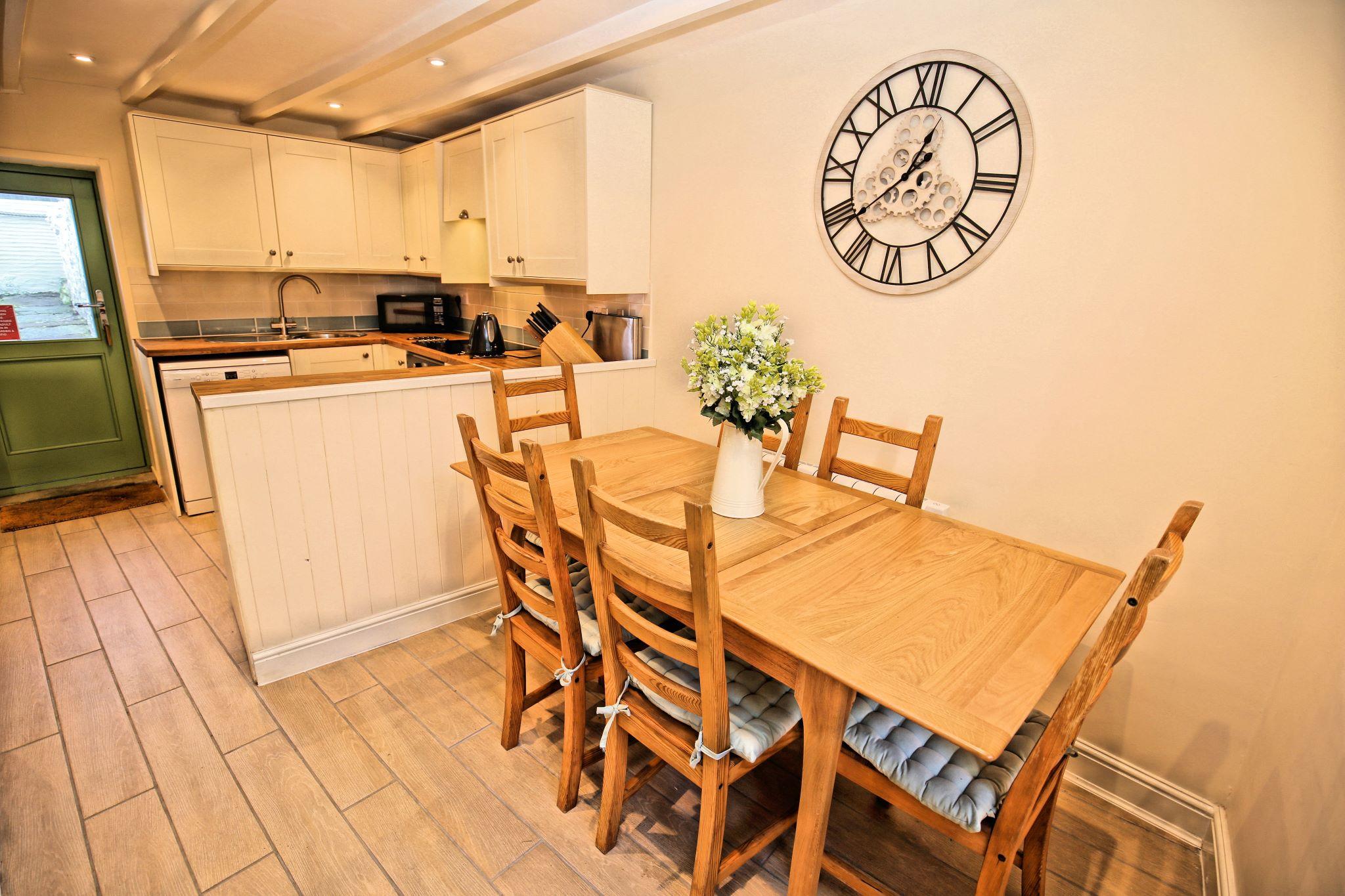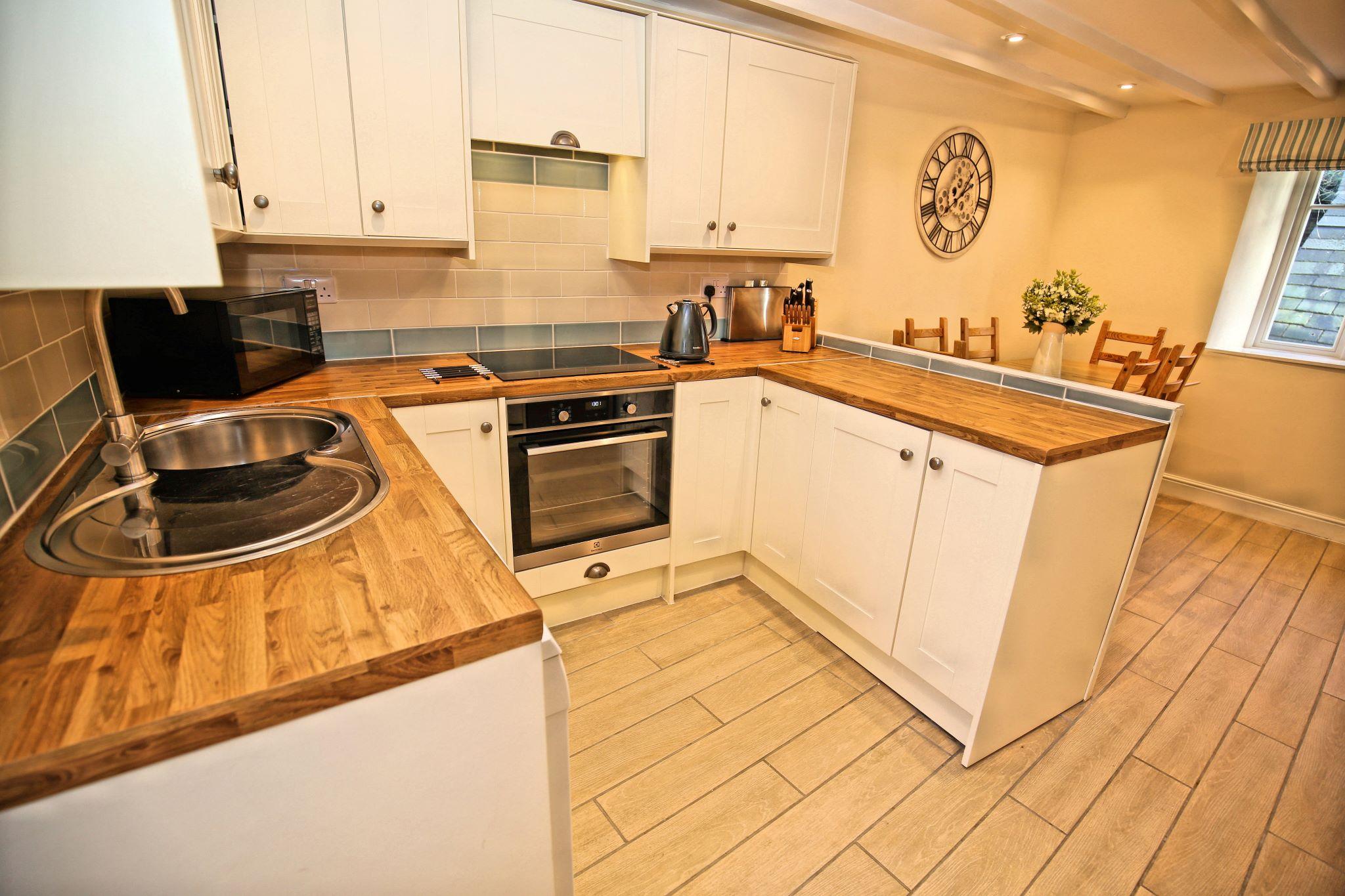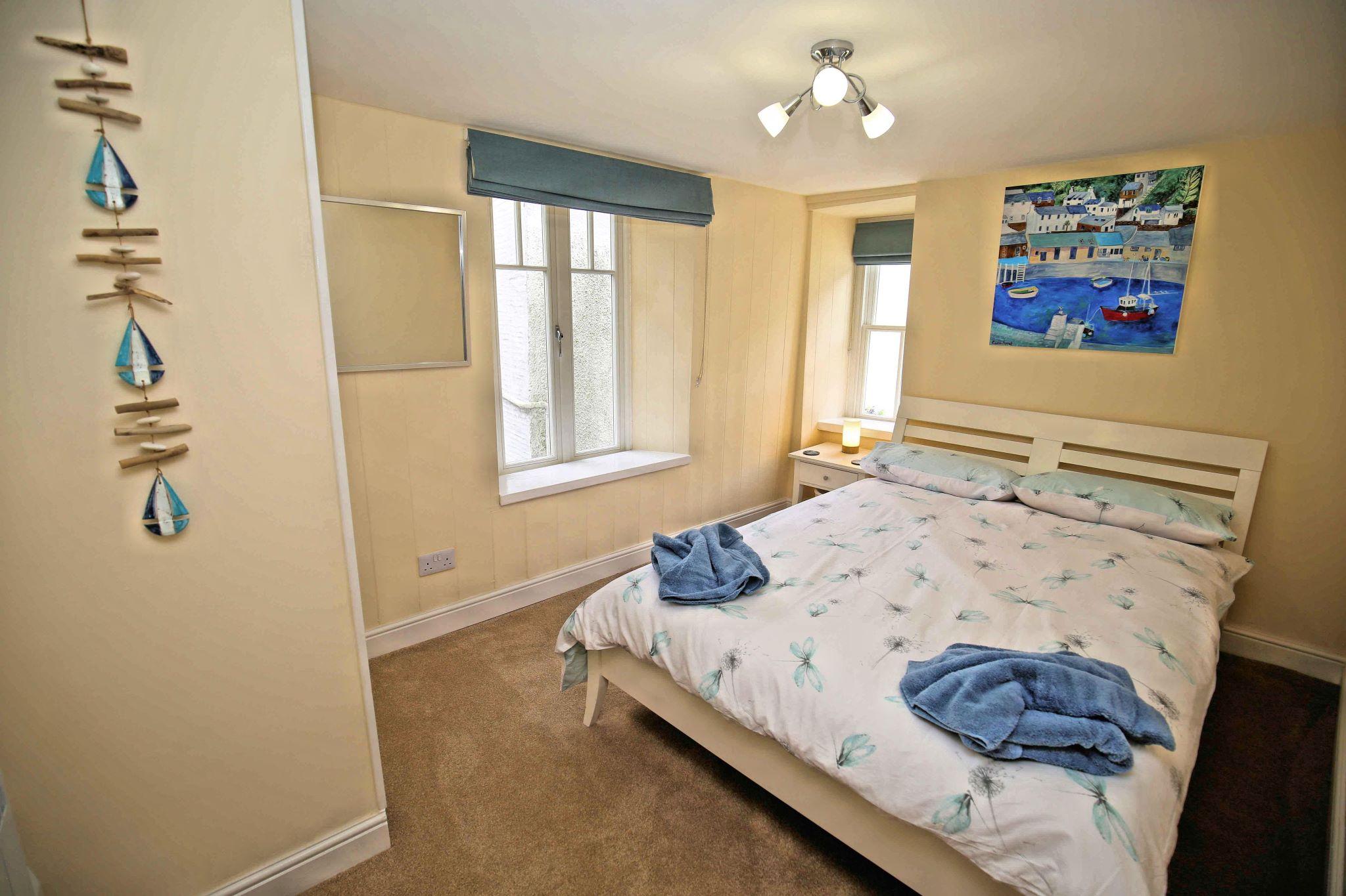 Barfleur House is a completely refurbished 3 bedroom property located very close to Polperro harbour. The house is set over 3 floors has 2 bath/shower rooms and also has an attractive outside seating area to take in the full atmosphere of this picturesque working fishing harbour. 13 steps take you to the front door (note: door width is 20 inches, a standard door is 30 inches), entry is via a porch into a very comfortable lounge with log burner and feature wooden mantlepiece. A further door to a large kitchen/diner, the kitchen is well equipped for self catering and includes an electric oven and hob, microwave, dishwasher, a 60/40 fridge/freezer and a washing machine. There is seating for 6 guests in the dining area. A rear door off the kitchen leads out to steps up (18 steps with a minimum width of 19 inches) to the outside seating area which features table and chairs and two sun loungers. The first floor has two double bedrooms and a twin bedroom, there is also a shower room with toilet on the first floor. The second floor is a second lounge with feature beamed vaulted ceiling, please note there are varying head heights due to the sloping ceiling but the main space is suitable for all. There is also a bathroom with corner bath and toilet on the second floor. Parking for one car is included (a permit for the main Polperro Car Park), the house also offers wi-fi and is pet friendly and up to 2 dogs can stay free of charge. Heating throughout is via electric panel heaters (heated towel rails in the bathrooms). Logs for the log burner are not supplied but can be purchased locally